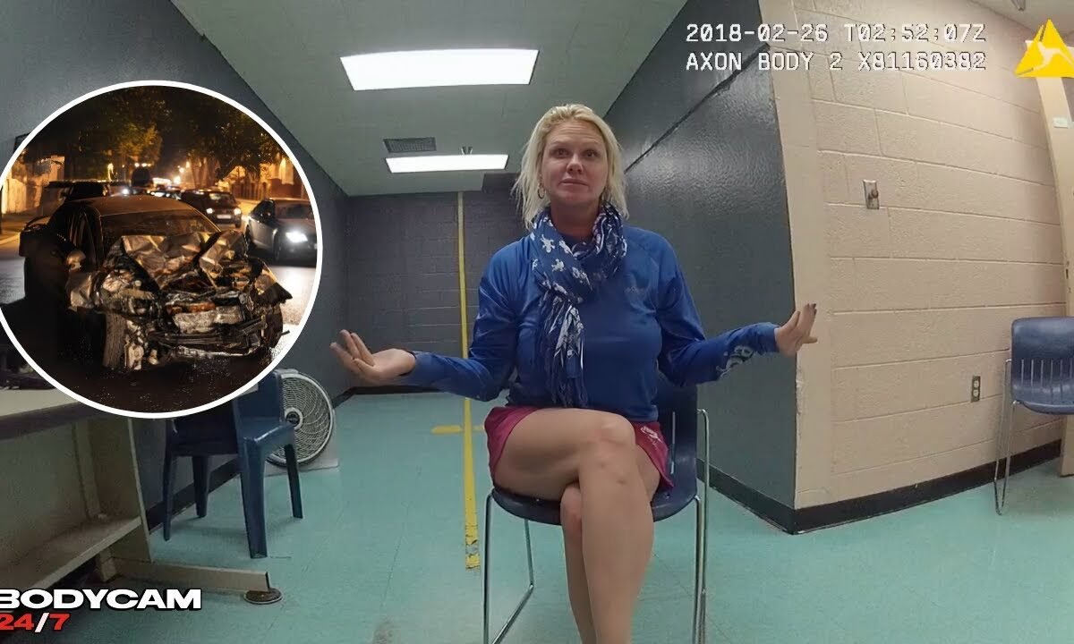 On February 26, 2018, in Key West Florida, police body cam footage depicts a nighttime crash scene. Officers at the scene speak with a woman and investigate the car accident. The body camera then follows the woman into a holding room where officers continue to question her following the crash…