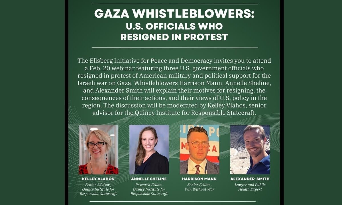The Ellsberg Initiative for Peace and Democracy webinar featuring three U.S. government officials who resigned in protest of American military and political support for the Israeli war on Gaza. Whistleblowers Harrison Mann, Annelle Sheline, and Alexander Smith will explain their motives for resigning, the consequences of their actions, and their views of U.S. policy in the region. The discussion will be moderated by Kelley Vlahos, senior advisor for the Quincy Institute for Responsible Statecraft.