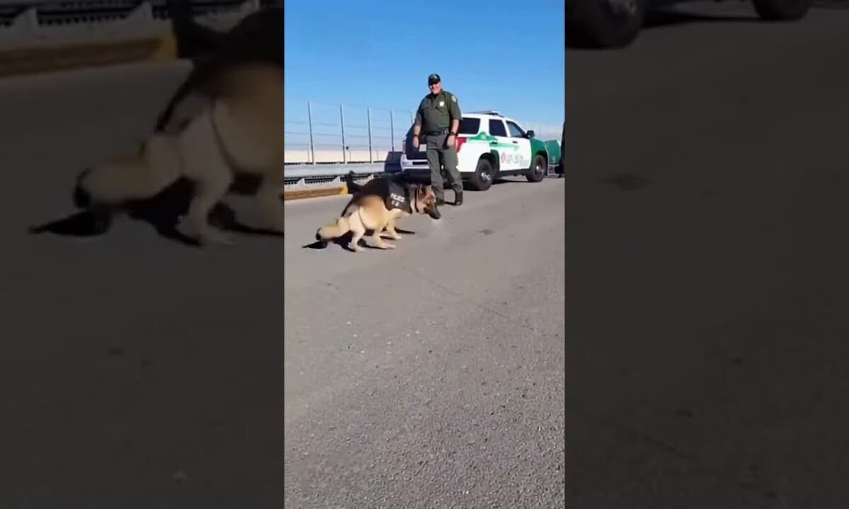 This unbelievable moment was accidentally captured on a phone at a high-security border checkpoint USA MEXICO. A trained police K9, wearing a full patrol vest, suddenly starts jumping, spinning, and dancing uncontrollably after encountering a mysterious powder scattered on the road.