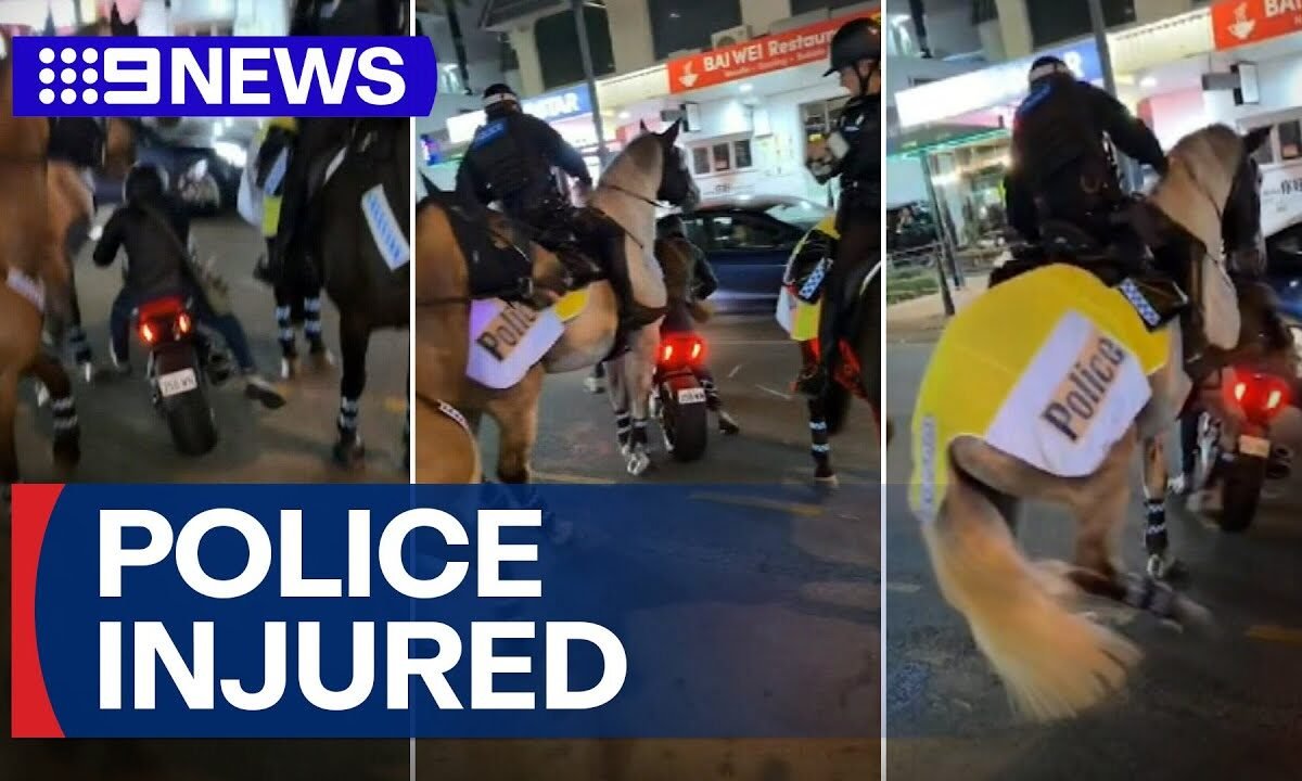 Two police horses and an officer have been injured after they were struck by a motorbike in Surfers Paradise on Saturday night. | *Subscribe and 🔔: http://9Soci.al/KM6e50GjSK9*