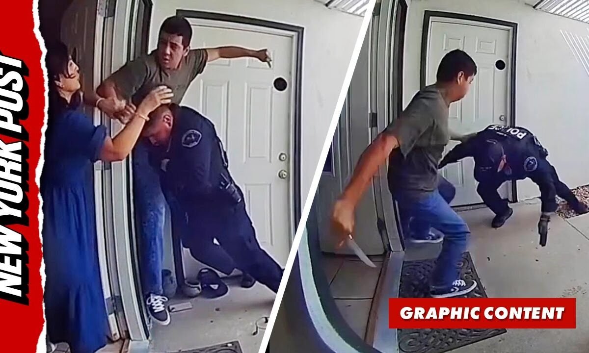 Footage released by the Cathedral City Police Department shows an officer approaching the front door of a California home only to be met by a young man lunging at him with a knife. The assailant, Juan Francisco Sosa Jr., began stabbing the officer in his upper body while an older woman in the background screamed and attempted to stop the attack.